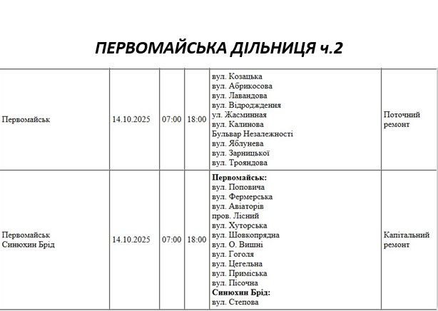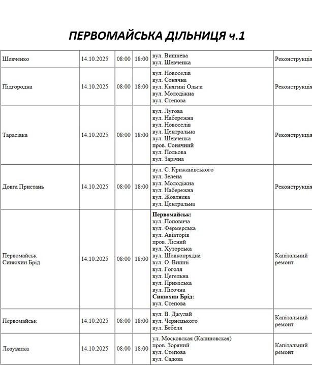 Графік відключення світла по адресах 14 жовтня, Первомайська дільниця світло на миколаївщині 14.10 4