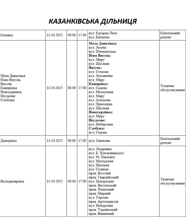 Графік відключення світла по адресах 14 жовтня, Казанківська дільниця АТ «Миколаївобленерго»