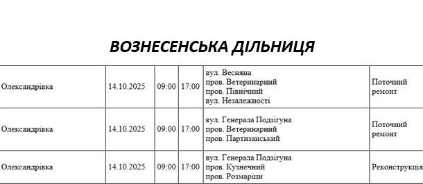 Графік відключення світла по адресах 14 жовтня, Вознесенська дільниця АТ «Миколаївобленерго»