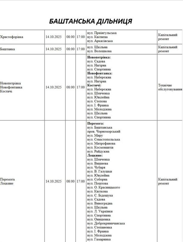 Графік відключення світла по адресах 14 жовтня, Баштанська дільниця АТ «Миколаївобленерго»