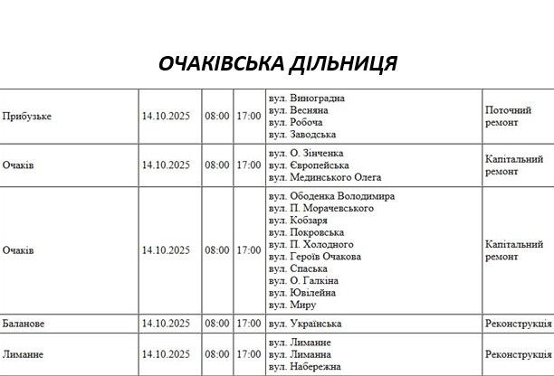 Графік відключення світла по адресах 14 жовтня, Очаківська дільниця АТ «Миколаївобленерго»