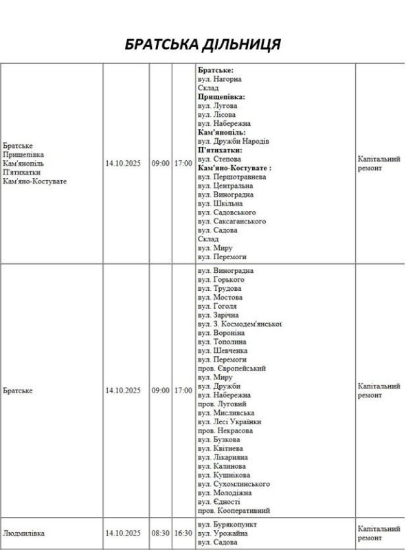 Графік відключення світла по адресах 14 жовтня, Братська дільниця АТ «Миколаївобленерго»