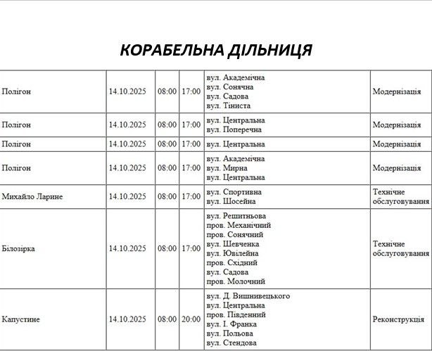 Графік відключення світла по адресах 14 жовтня, Корабельна дільниця АТ «Миколаївобленерго»