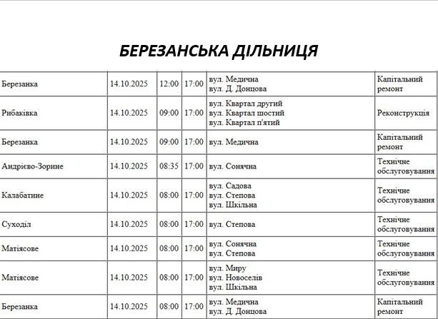 Графік відключення світла по адресах 14 жовтня, Березанська дільниця АТ «Миколаївобленерго»