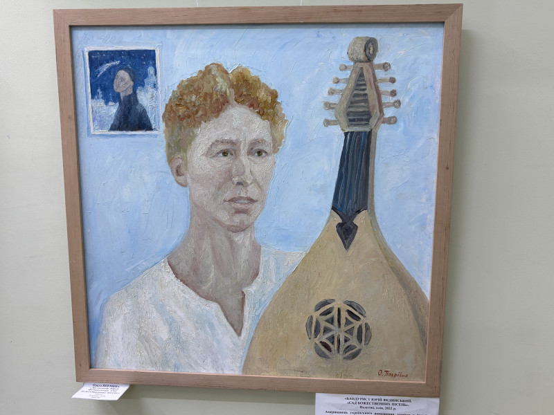 "На виставці представлені портрети наших спільних знайомих, які бували у нас в музеї зі своїми заходами: бандурист Юрій Фединський, американець, який живе в Україні, виступає, вчить дітей гри на бандурі, і сам майстер по виготовленню старовинних музичних інструментів, співачка Олеся "Чайка", зображена в червоній хустці з червоним намистом у вишиванці, саме в такому образі вона виступала в нашому музеї", — каже Олена.