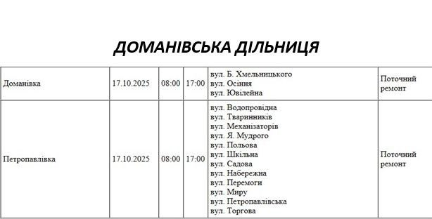 Графік відключення світла по адресах 17 жовтня, Доманівська дільниця. АТ «Миколаївобленерго»