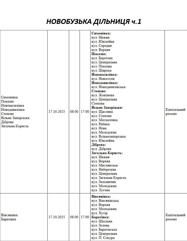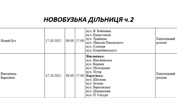 Графік відключення світла по адресах 17 жовтня, Новобузька дільниця. АТ «Миколаївобленерго»