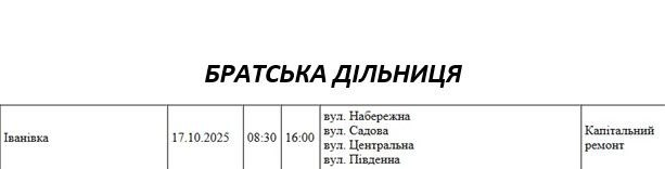 Графік відключення світла по адресах 17 жовтня, Братська дільниця. АТ «Миколаївобленерго»