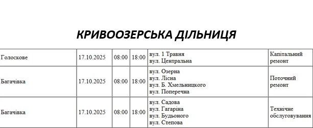 Графік відключення світла по адресах 17 жовтня, Кривоозерська дільниця. АТ «Миколаївобленерго»