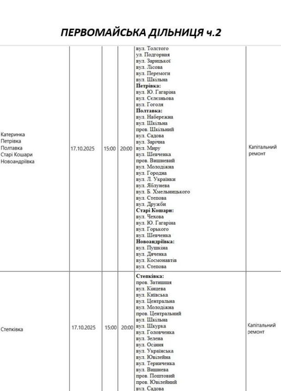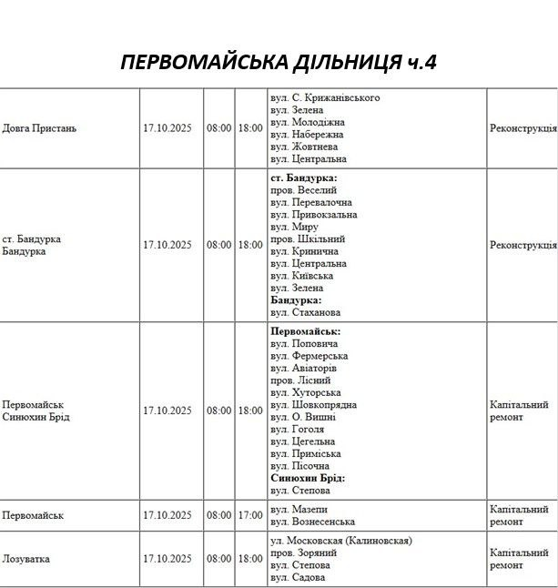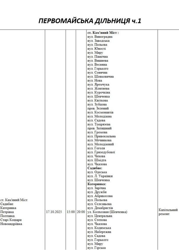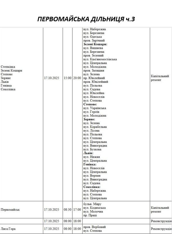 Графік відключення світла по адресах 17 жовтня, Первомайська дільниця. АТ «Миколаївобленерго»