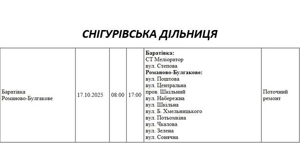 Графік відключення світла по адресах 17 жовтня, Снігурівська дільниця. АТ «Миколаївобленерго»