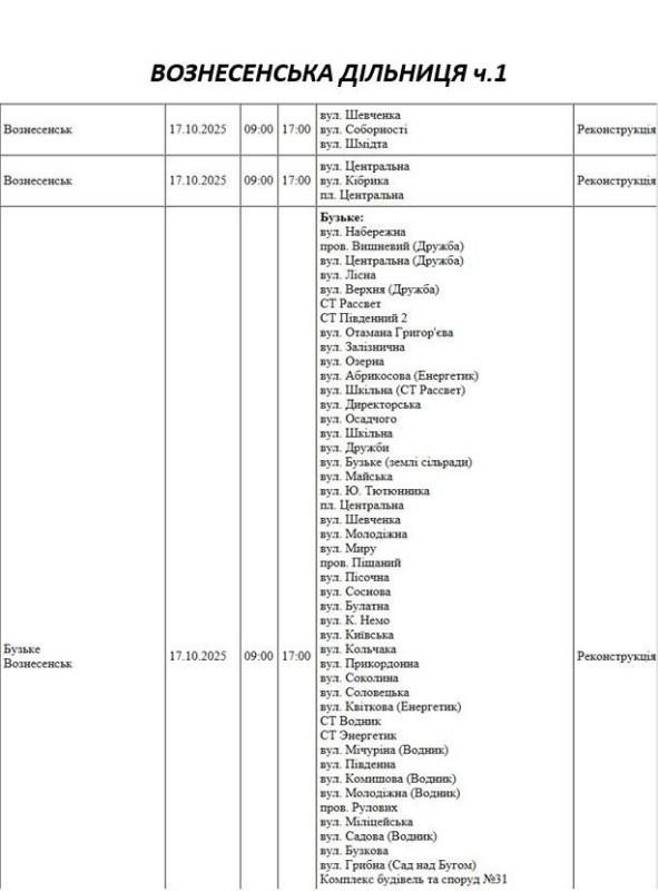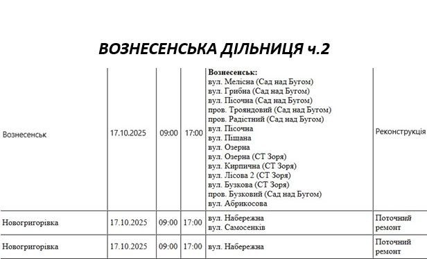 Графік відключення світла по адресах 17 жовтня, Вознесенська дільниця. АТ «Миколаївобленерго»