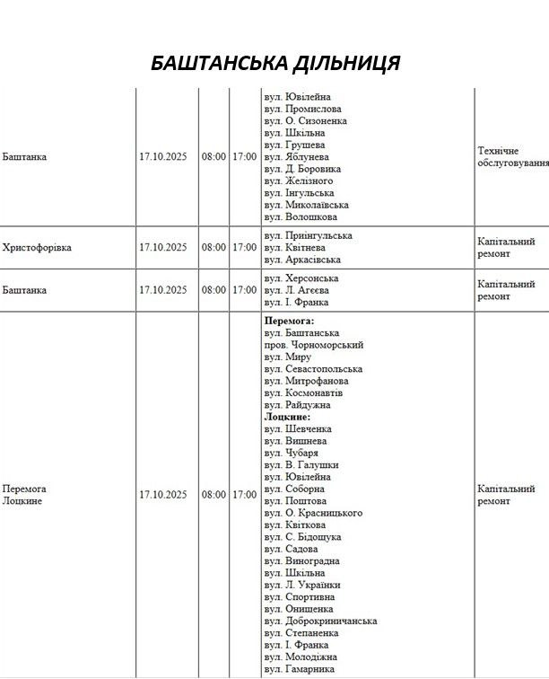 Графік відключення світла по адресах 17 жовтня, Баштанська дільниця. АТ «Миколаївобленерго»