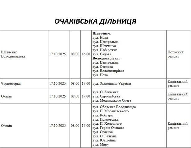 Графік відключення світла по адресах 17 жовтня, Очаківська дільниця. АТ «Миколаївобленерго»
