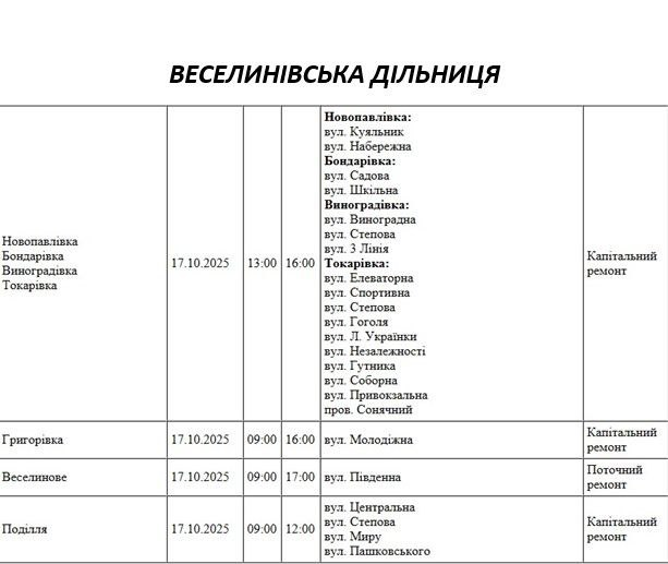Графік відключення світла по адресах 17 жовтня, Веселинівська дільниця. АТ «Миколаївобленерго»