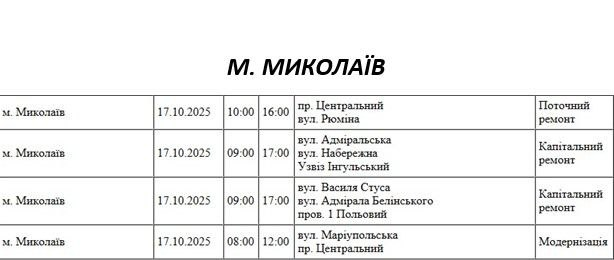 Графік відключення світла по адресах 17 жовтня, Миколаїв. АТ «Миколаївобленерго»
