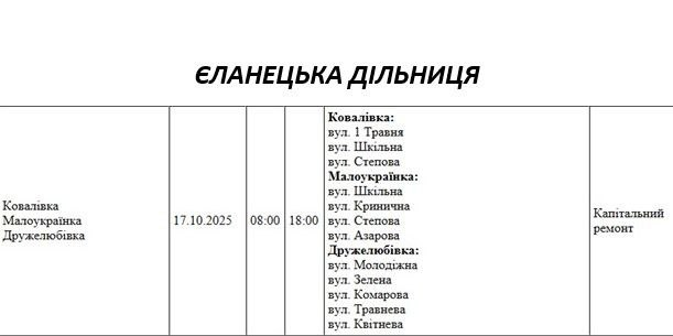 Графік відключення світла по адресах 17 жовтня, Єланецька дільниця. АТ «Миколаївобленерго»