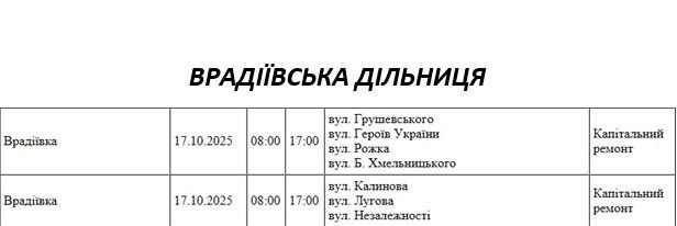 Графік відключення світла по адресах 17 жовтня, Врадіївська дільниця. АТ «Миколаївобленерго»