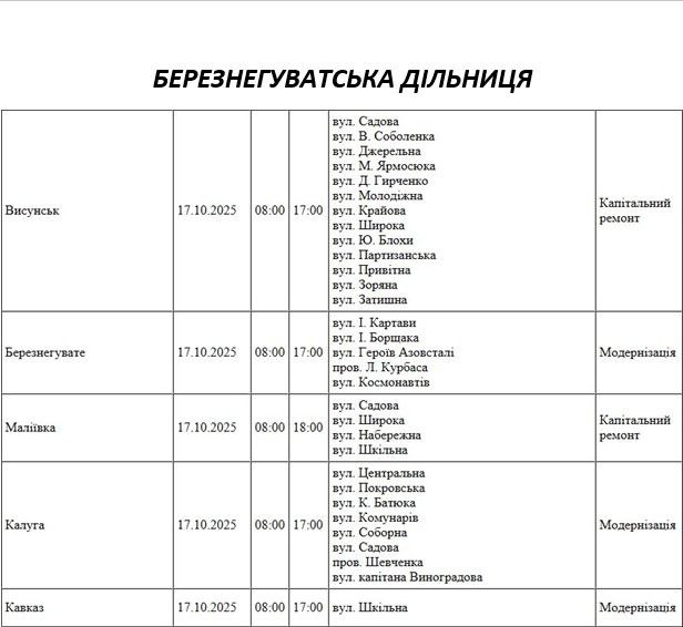 Графік відключення світла по адресах 17 жовтня, Березнегуватська дільниця. АТ «Миколаївобленерго»