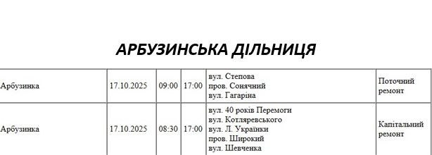Графік відключення світла по адресах 17 жовтня, Арбузинська дільниця. АТ «Миколаївобленерго»