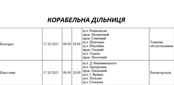 Графік відключення світла по адресах 17 жовтня, Корабельна дільниця. АТ «Миколаївобленерго»
