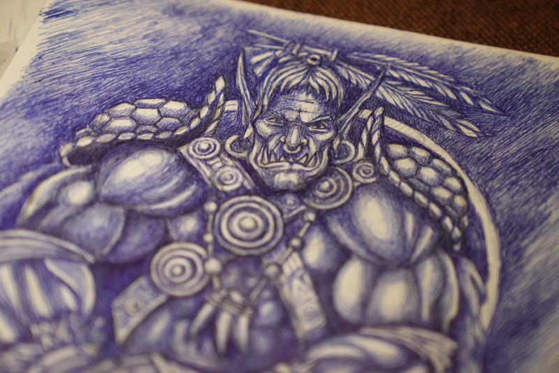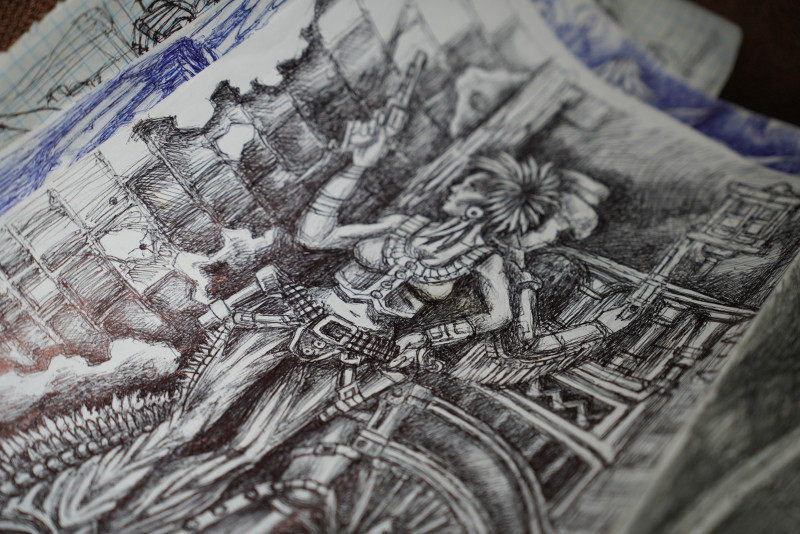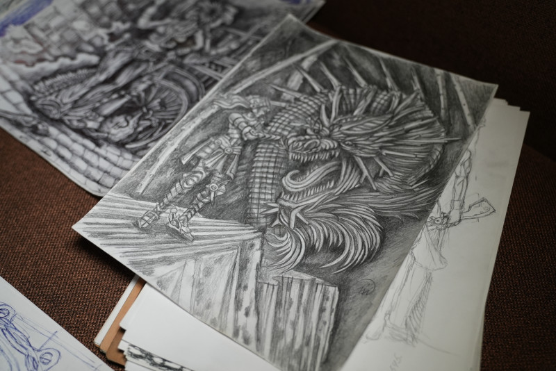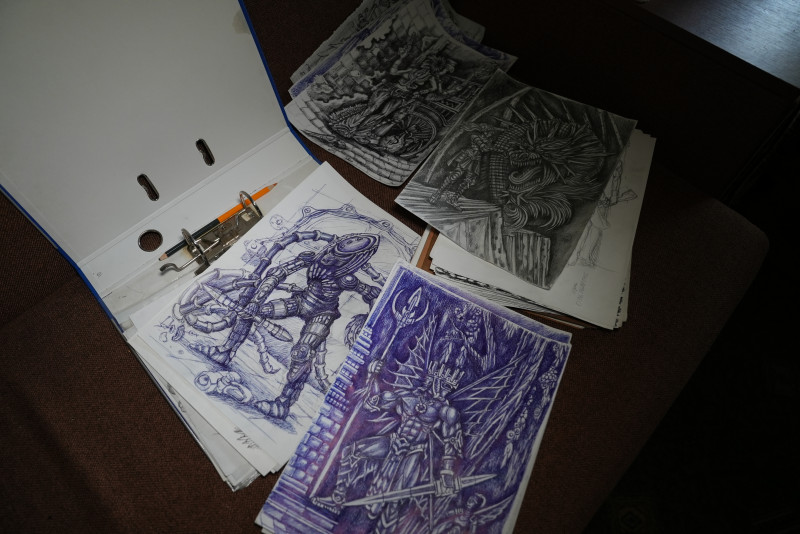 "Кожна робота — це музика. Без неї погано. Хоча в тиші іноді деякі речі теж відбуваються. Я люблю деталізацію і тому малюється довго, тобто до 20 годин (на одну роботу на А4 — ред.)", — розповів Михайло.