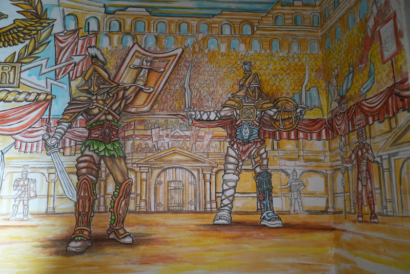 На інших стінах зображені також римські полководці Спартак і Крікс на арені Колізею, фентезійні мотиви у китайському стилі та українська родина у грушевому саду.