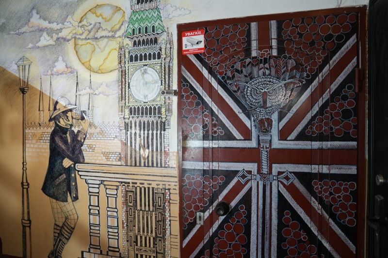 "Тут я вирішив трохи розвинути тематику Шерлока Холмса, Англії, Біг-Бен — це все звідти, й склав таку композицію. Потім, звичайно ж, я перейшов на свої двері: у тій самій тематиці — англійський прапор, сови та мечі, ось у такому дусі. З чого все почалося? Це просто олівці та фломастери незмивні", — розповів митець.