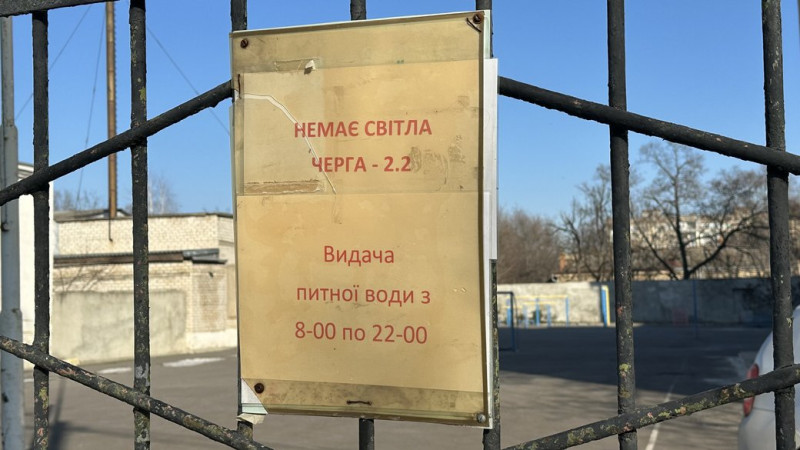 Табличка з графіком відключення світла висить на воротах біля точки видачі води. Суспільне Миколаїв/Назарій Рубаняк