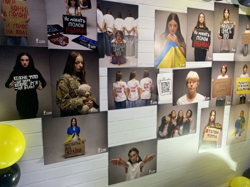 Стенд із фотографіями підлітків із гаслами на підтримку українських військовополонених. Суспільне Миколаїв/Богдана Будулуца