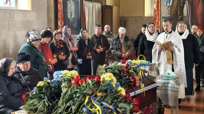 Прощання із загиблим у храмі: присутні тримають запалені свічки біля труни, вкритої квітами та синьо-жовтими стрічками. Суспільне Миколаїв/Федір Бондар