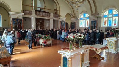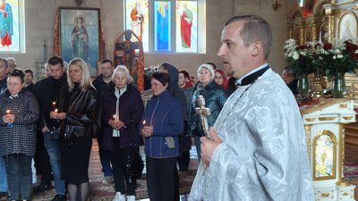 Фрагмент церемонії прощання в храмі: присутні зі свічками слухають службу. Суспільне Миколаїв/Федір Бондар