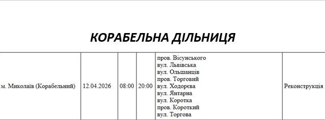 Графік відключення світла по адресах 12 квітня, Корабельна дільниця. АТ «Миколаївобленерго»