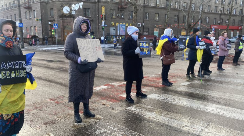 Жителі Миколаєва вийшли із плакатами та прапорами у центр міста о 9:00, аби вшанувати памʼять загиблих загальнонаціональною хвилиною мовчання. До заходу доєдналися близько 40 людей.