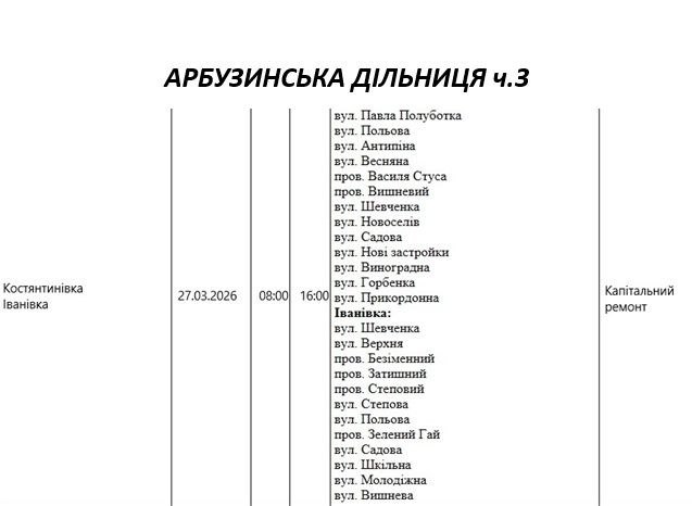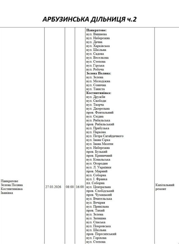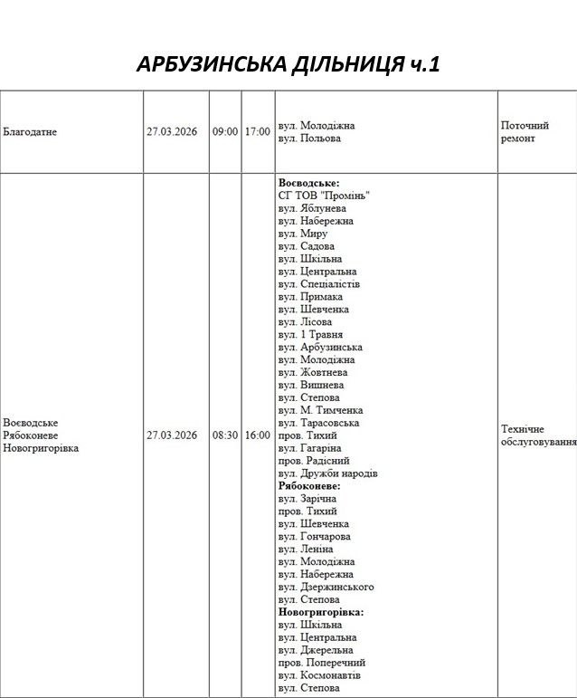 Графік відключення світла по адресах 27 березня, Арбузинська дільниця АТ «Миколаївобленерго»