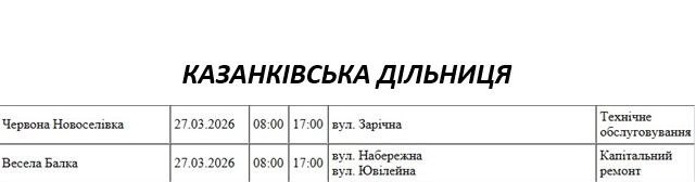 Графік відключення світла по адресах 27 березня, Казанківська дільниця АТ «Миколаївобленерго»