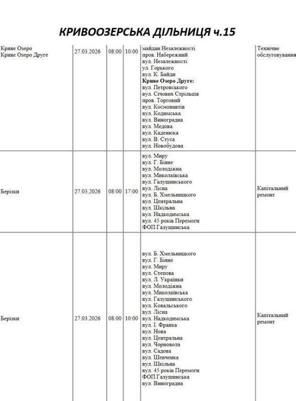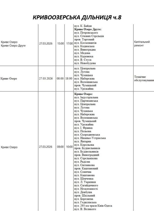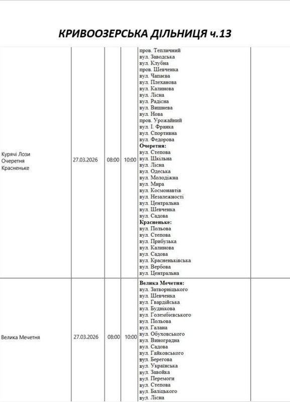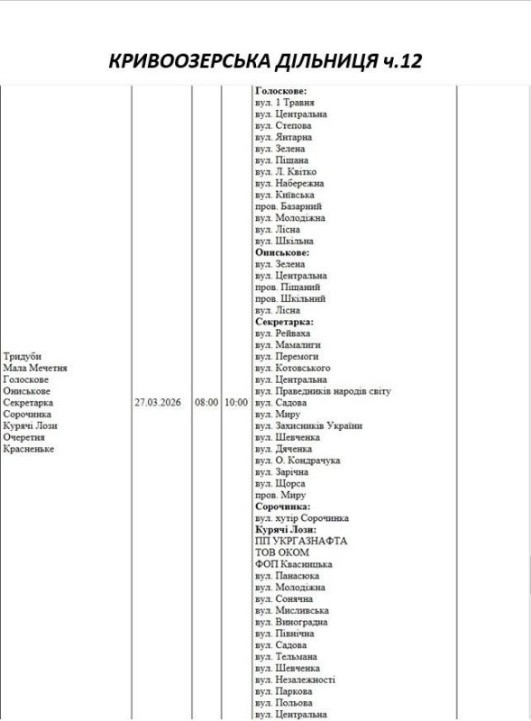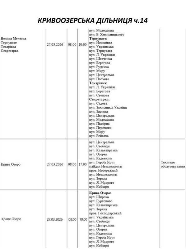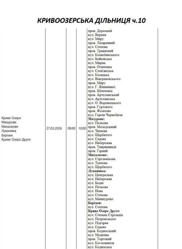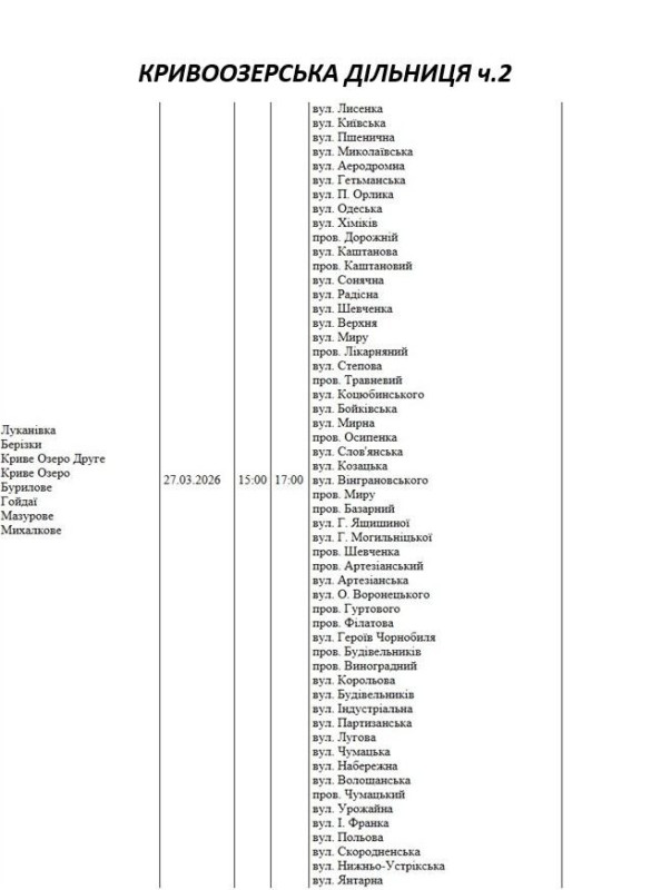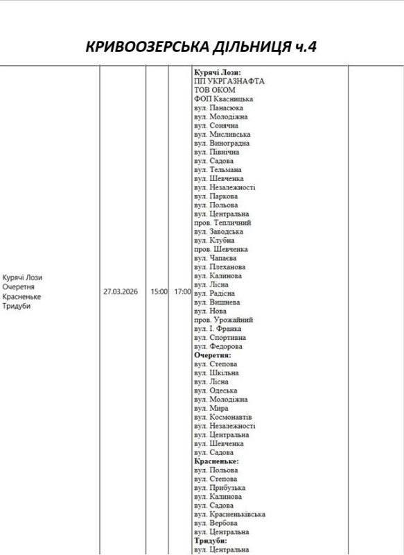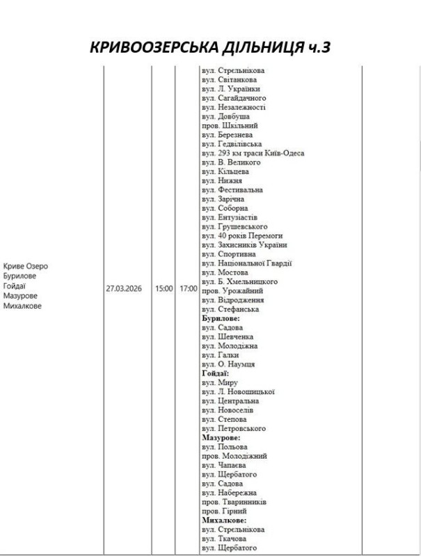 Графік відключення світла по адресах 27 березня, Кривоозерська дільниця АТ «Миколаївобленерго»