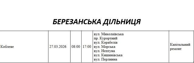 Графік відключення світла по адресах 27 березня, Березанська дільниця АТ «Миколаївобленерго»