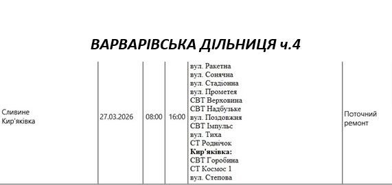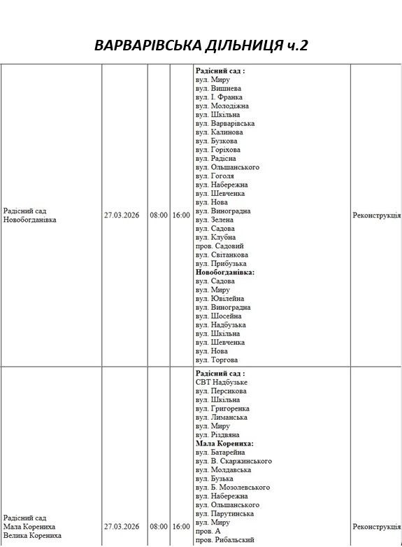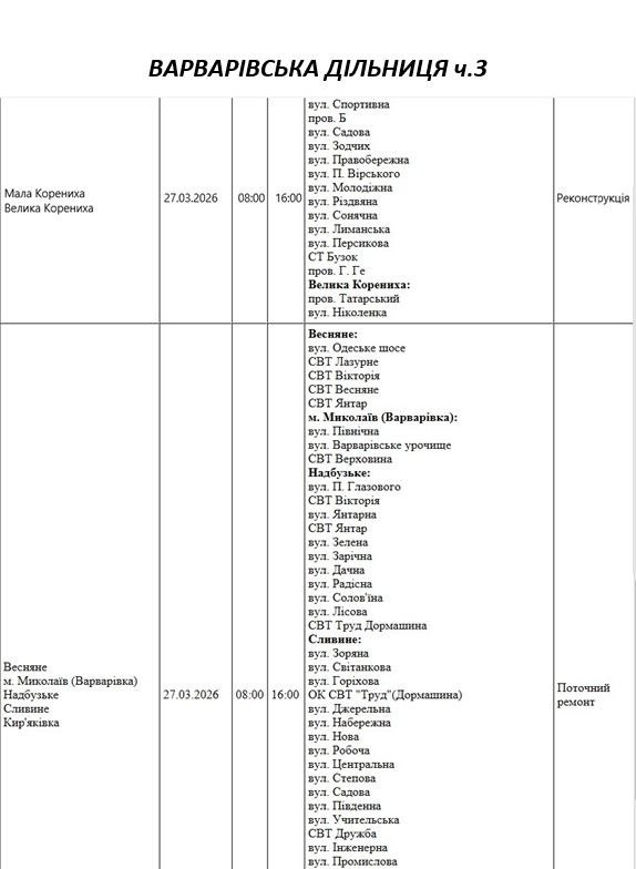 Графік відключення світла по адресах 27 березня, Варварівська дільниця АТ «Миколаївобленерго»