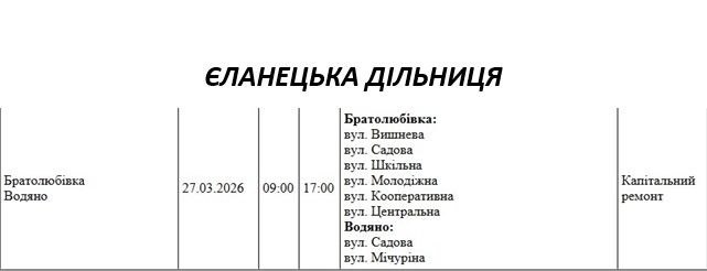 Графік відключення світла по адресах 27 березня, Єланецька дільниця АТ «Миколаївобленерго»