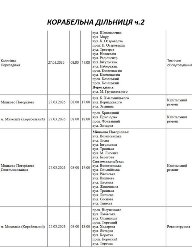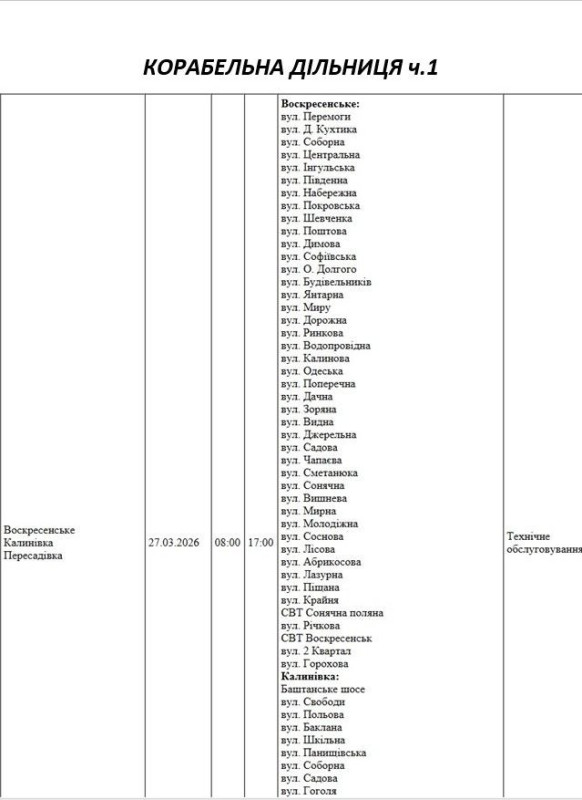 Графік відключення світла по адресах 27 березня, Корабельна дільниця АТ «Миколаївобленерго»