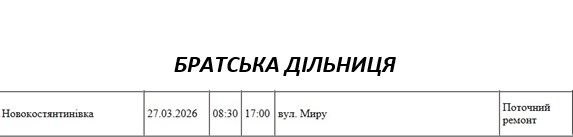 Графік відключення світла по адресах 27 березня, Братська дільниця АТ «Миколаївобленерго»