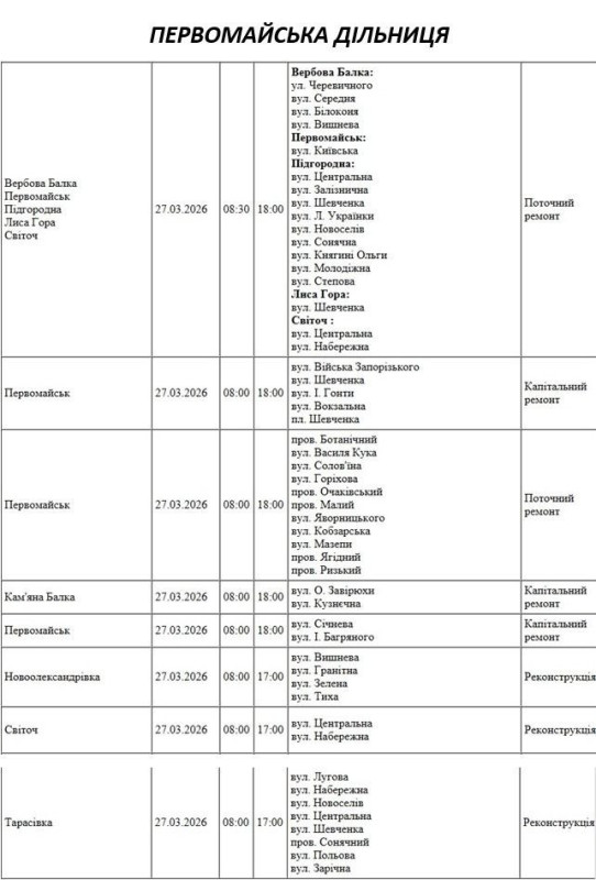 Графік відключення світла по адресах 27 березня, Первомайська дільниця АТ «Миколаївобленерго»
