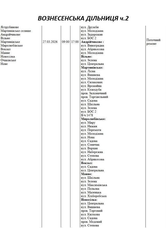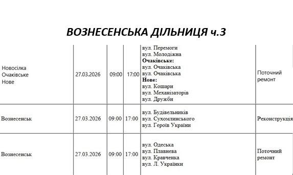 Графік відключення світла по адресах 27 березня, Вознесенська дільниця АТ «Миколаївобленерго»