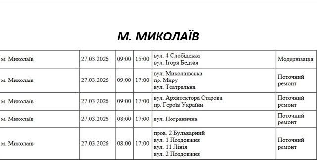Графік відключення світла по адресах 27 березня, Миколаївська дільниця АТ «Миколаївобленерго»