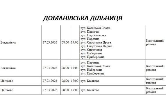 Графік відключення світла по адресах 27 березня, Доманівська дільниця АТ «Миколаївобленерго»