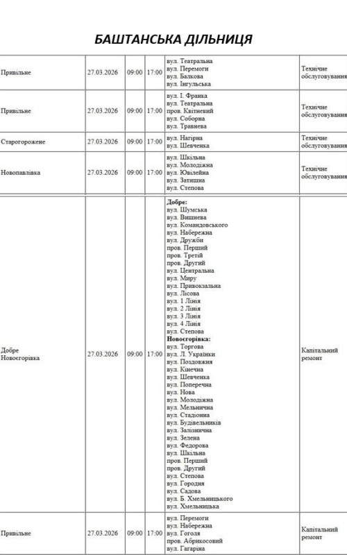 Графік відключення світла по адресах 27 березня, Баштанська дільниця АТ «Миколаївобленерго»