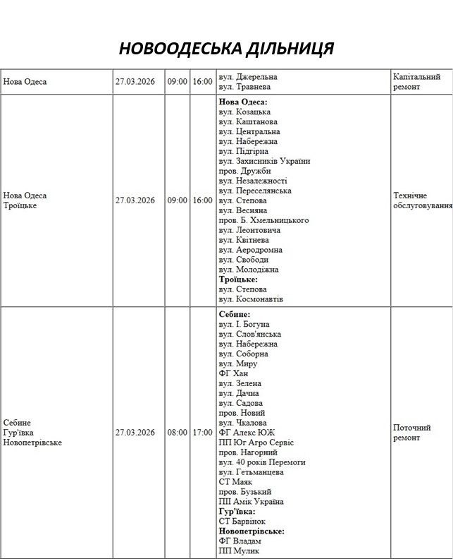 Графік відключення світла по адресах 27 березня, Новоодеська дільниця АТ «Миколаївобленерго»