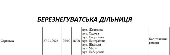 Графік відключення світла по адресах 27 березня, Березнегуватська дільниця АТ «Миколаївобленерго»