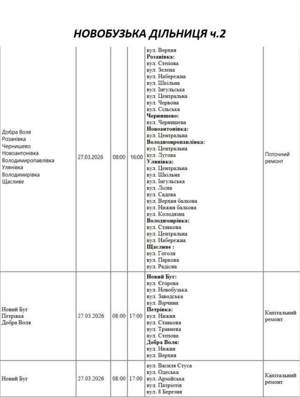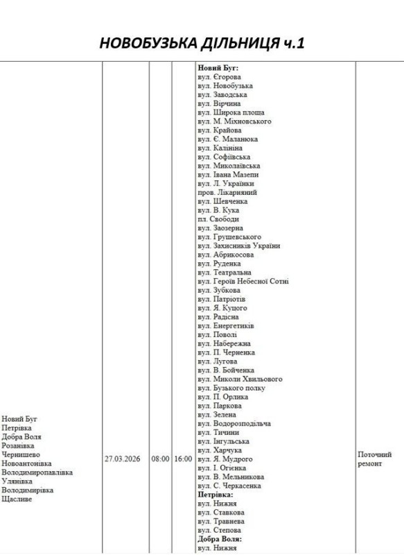 Графік відключення світла по адресах 27 березня, Новобузька дільниця АТ «Миколаївобленерго»
